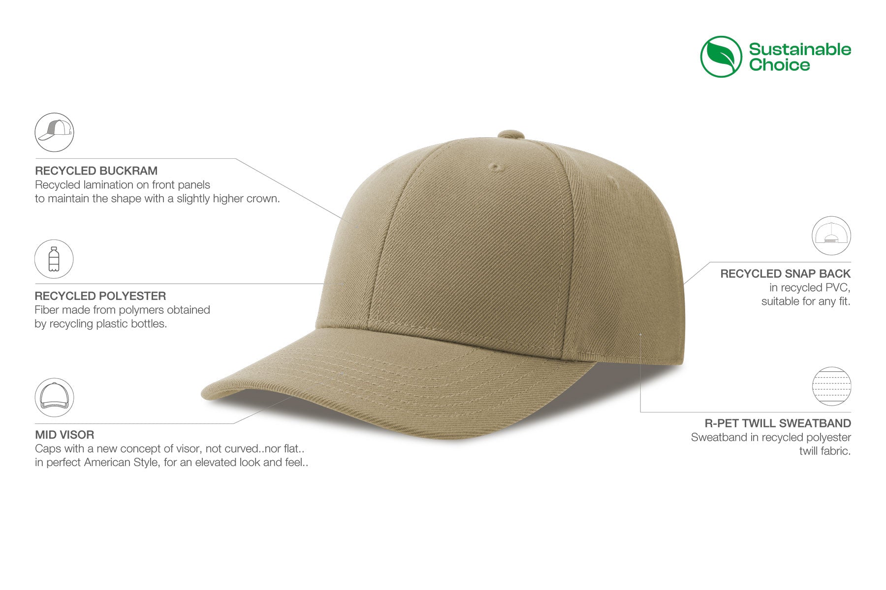 - Recycled polyester buckram inside front panels to maintain the shape with a slightly higher crown.