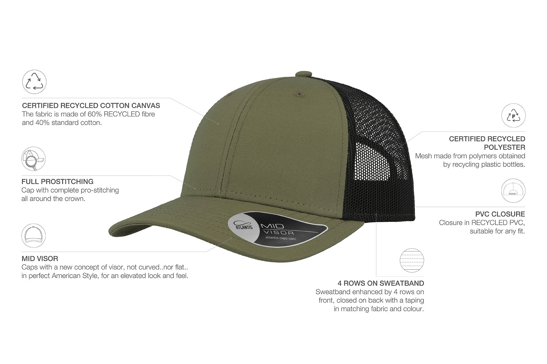 Main Fabric: Main fabric: 60% GRS-certified recycled cotton, 40% classic cotton – Side & Back: 100% GRS-certified recycled polyester mesh.